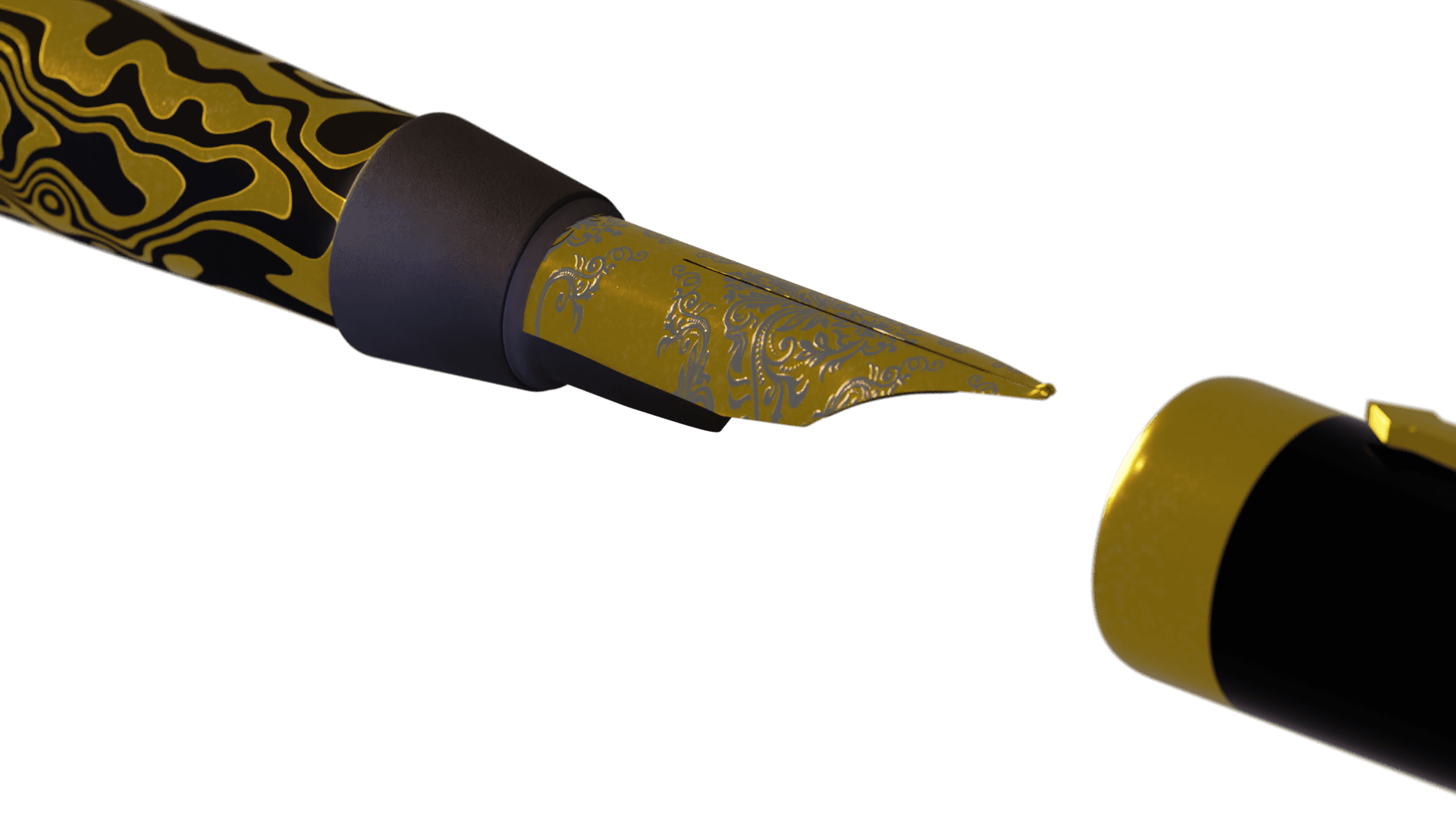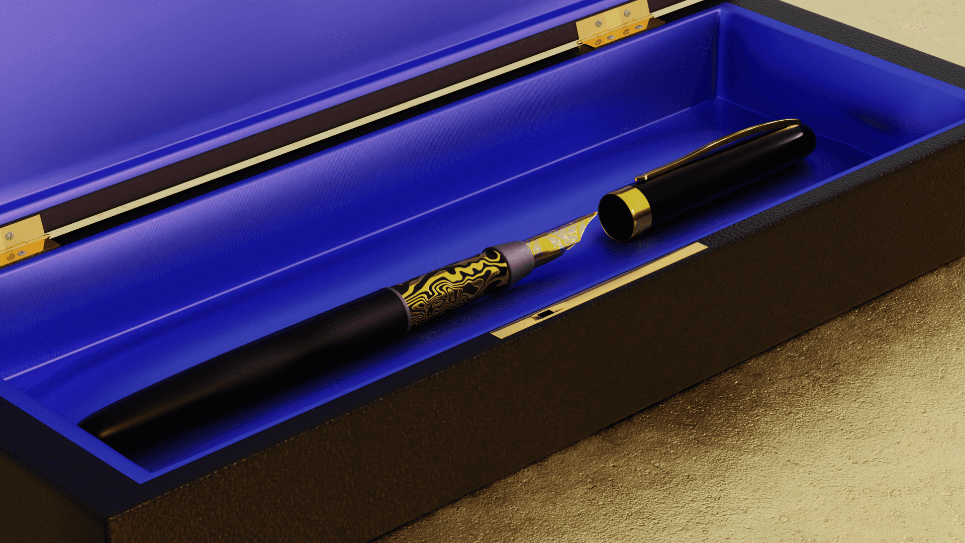 Le stylo a été pensé comme un bijou, mis en valeur dans un écrin noir et bleu cobalt. La modélisation, contient 3205 vertex pour le stylo et 6475 pour l’écrin, cela permet un rendu fluide tout en conservant une grande lisibilité des détails.